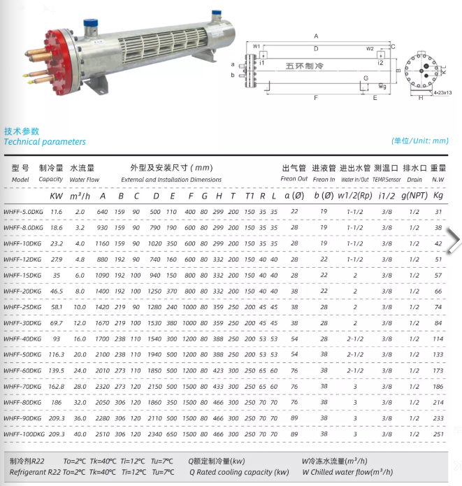 Please advise us the Type of heat exchangers, Material , Heat Exchanger Capacity, Water Flow, Water Temperature in and out ,Refrigrant Freon Type, Quantity, or any requirements in size.